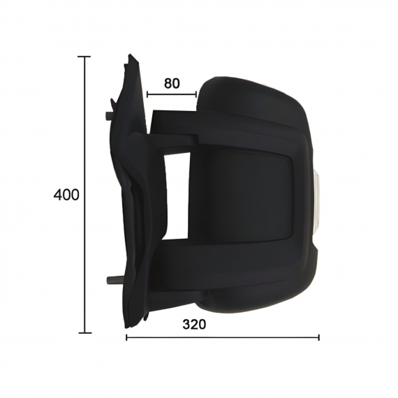 Completo, con carcasa negra. Con piloto intermitente blanco (5w). Para una lámpara WY5W. Cristal convexo, y cristal inferior de ángulo muerto. Ajuste interior eléctrico, térmico. Brazo corto. Conector de 8 pines. Dimensiones: Ancho 400mm y largo 320mm.