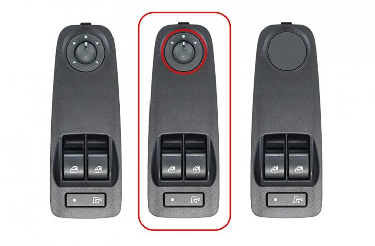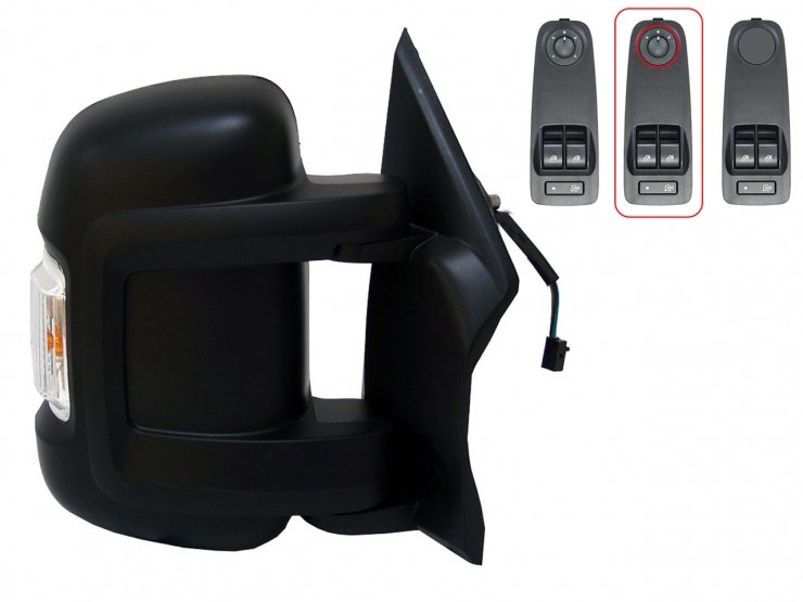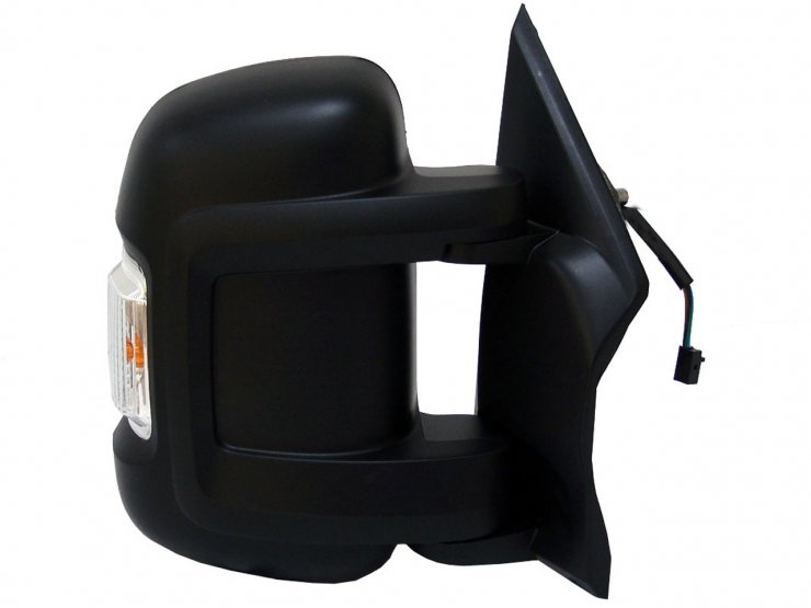 Completo. Color negro, y cristal convexo. Espejo ángulo muerto. Térmico. Brazo corto. Con piloto intermitente W16W. Conector de 6 pines.