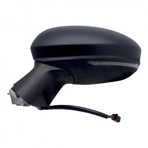 Completo, con carcasa negra. Con intermitente blanco y cristal asférico (ángulo muerto). Ajuste interior eléctrico, térmico, abatible manualmente. Con conector de 7 pines.